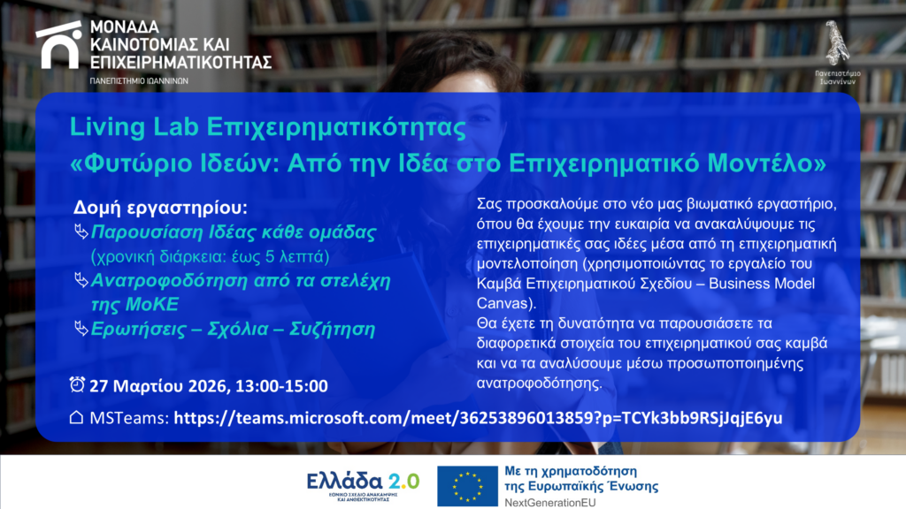Στο πλαίσιο του κύκλου Living Labs (Φυτώρια Ιδεών) της ΜοΚΕ του Πανεπιστημίου Ιωαννίνων, διοργανώνεται το 2ο βιωματικό εργαστήριο επιχειρηματικότητας με τίτλο «Φυτώριο Ιδεών: Από την Ιδέα στο Επιχειρηματικό Μοντέλο».
